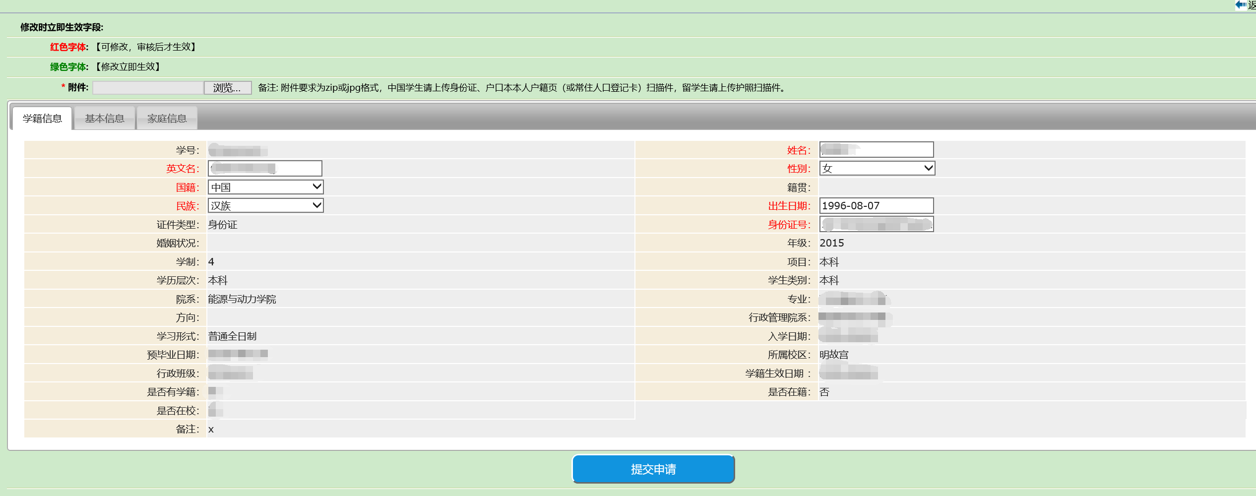 3、如信息有误,点击申请修改按钮,直接在相应信息框中填写正确的信息,按页面要求上传附件,提交申请。如只有毕业照片有误,仅需上传正确的照片。