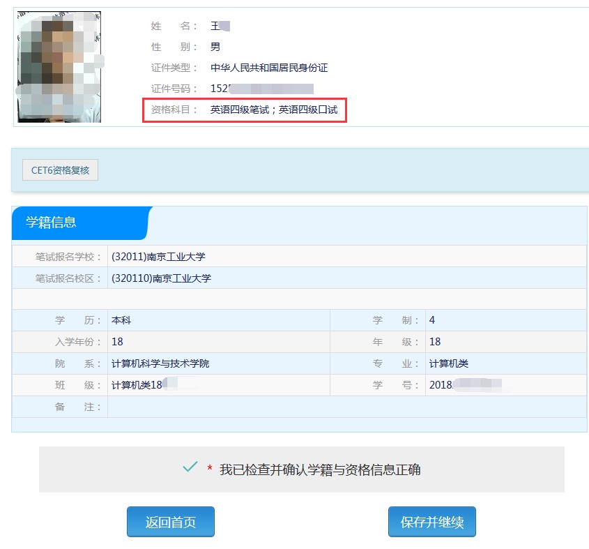 2.在“资格信息确认”界面仔细核对本人照片、姓名、证件号码、笔试报名学校、学号、班级等所有信息