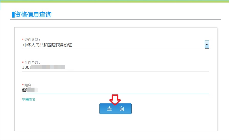 同意报名协议后进入资格信息查询界面,输入本人身份证号码,点击“查询”。