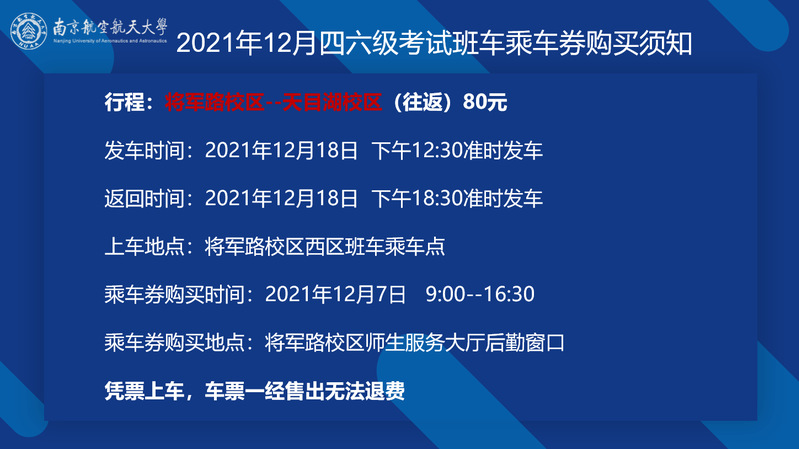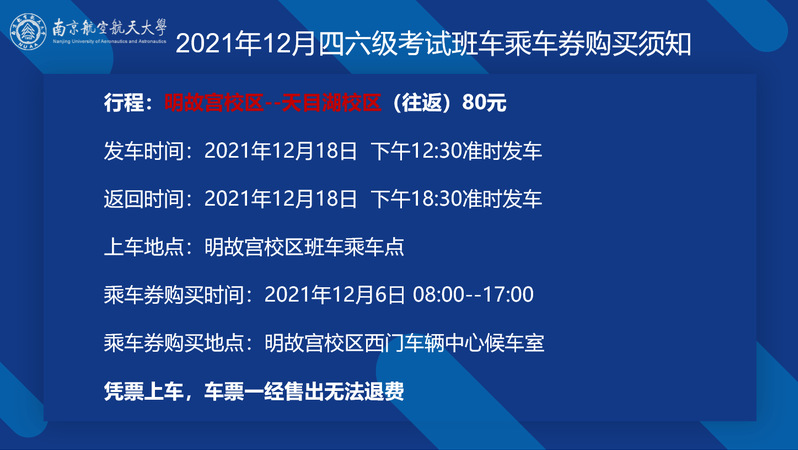 9月的CET报名通知中已提醒,跨校区报名考试的同学须自行解决交通问题。本次四六级考试得到后勤车队的大力支持,为南京两校区前往天目湖校区的考生安排车辆,提供乘车方便,同学们可提前购买乘车券,购买须知如下图所示。有意愿购买乘车券的同学,请以班级为单位,按时购买。