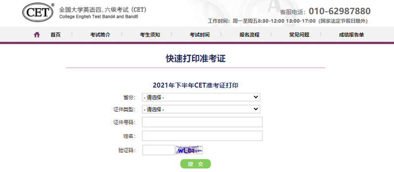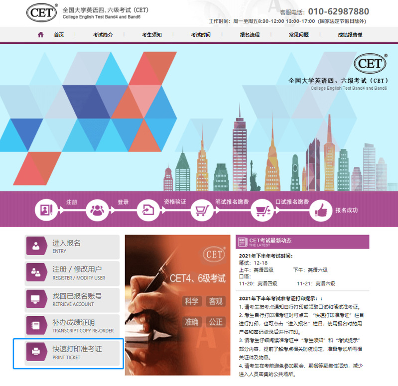 登录大学英语四六级考试报名网站http://cet-bm.neea.edu.cn,点击“快速打印准考证”一栏。