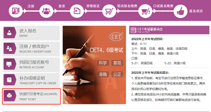 9129时起,同学们可登录大学英语四六级考试报名网站 http://cet-bm.neea.edu.cn ,点击“快速打印准考证”一栏。