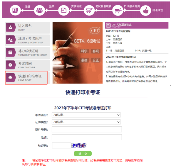 登录大学英语四六级考试报名网站 http://cet-bm.neea.edu.cn ,点击“快速打印准考证”一栏。