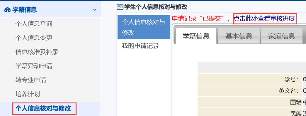 4.在学籍信息-个人信息核对与修改页面可查看信息修改审核进度。审核结束后在我的申请记录中查看审核结果。