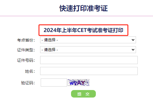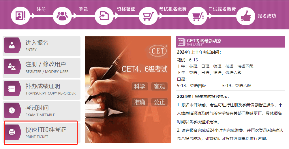 登录全国大学英语四、六级考试报名网站 http://cet-bm.neea.edu.cn ,点击“快速打印准考证”一栏。
