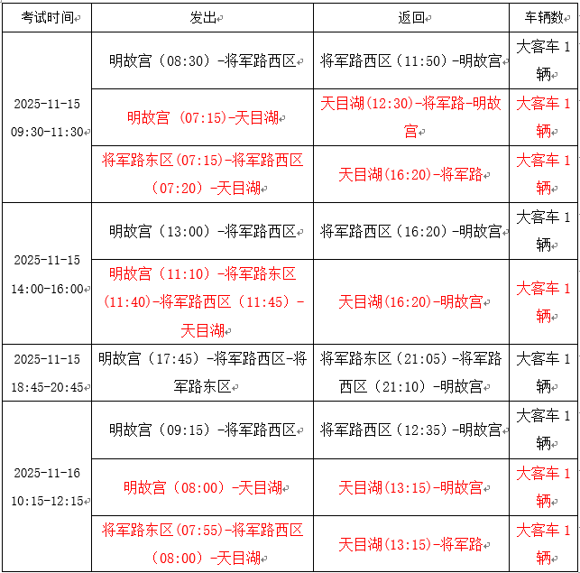 2025年11月15日-16日,我校在将军路校区、天目湖校区举行课程考试,请通知监考人员按时乘坐班车,参加监考,保证考试顺利进行!