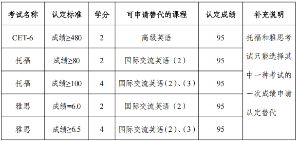 1.非外语专业本科生若在一、二年级尚未修满外语课10个学分要求的,则可在三、四年级期间以在校期间取得的CET-6、托福、雅思等考试的优良成绩,申请认定及替代大学英语课程学分。认定标准和学分见下表: