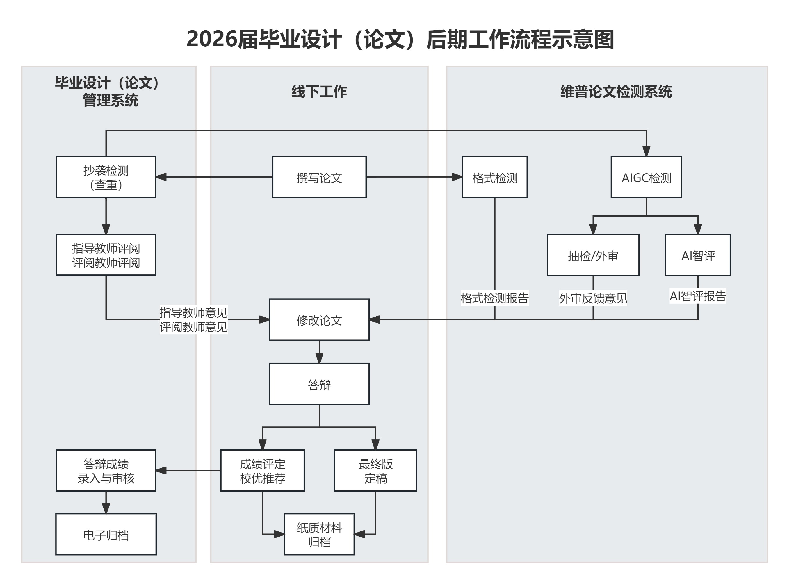 根据《关于做好2026届本科生毕业设计(论文)工作的通知》的要求,为扎实推进2026届本科生毕业设计(论文)(以下简称“毕设”)后期各项工作,充分运用人工智能等技术,严把毕设质量关,学校引入了“维普论文检测系统”,主要用于AIGC检测、格式校对、外审抽检、智能评审等,相关工作流程如下图所示。
