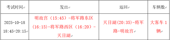 2025年10月18日,我校在将军路校区、天目湖校区举行课程考试,请通知监考人员按时乘坐班车参加监考,保证考试顺利进行。