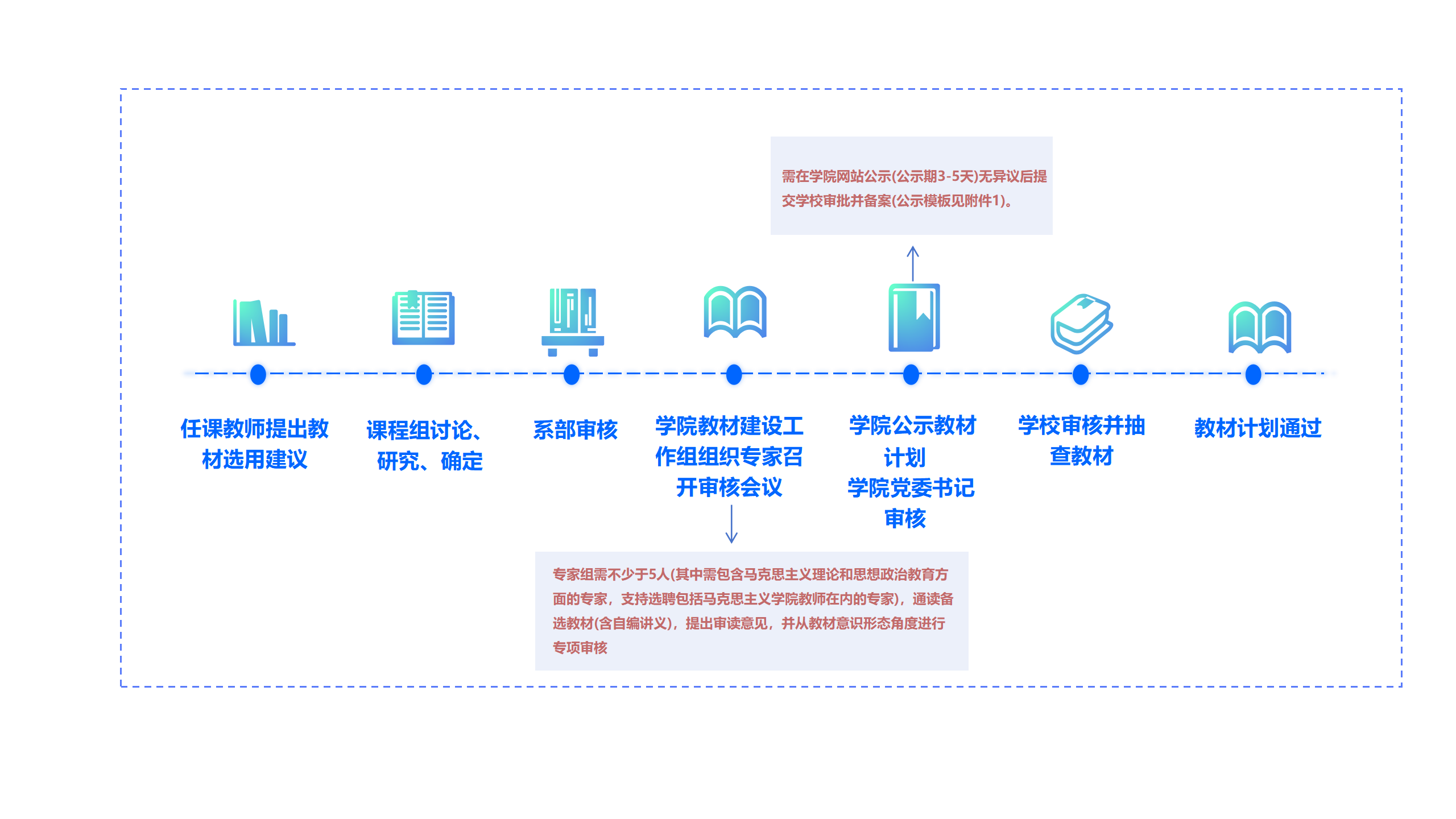 1.由本校教师主编出版的教材,如果没有经过学院审定程序并报教务处备案一律不得选用,请学院仔细核查是否已提交《教材出版审批表》并报学校备案。