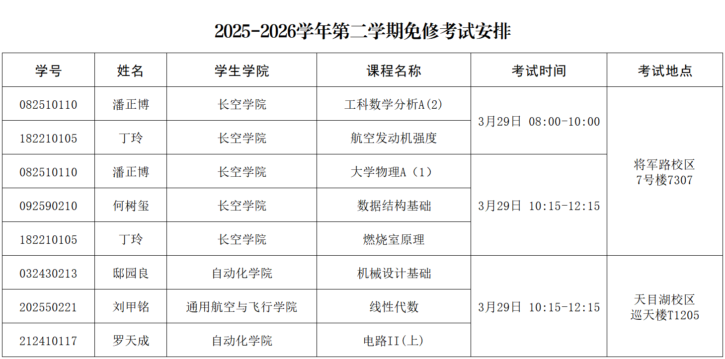 根据《南京航空航天大学本科生学籍管理办法》(校教字〔2024〕30号)中有关学生课程免修的规定,经过学生申请、教学单位审核等前期工作,现将2025-2026学年第二学期免修考试安排通知如下,请各学院通知相关学生准时参加考试。